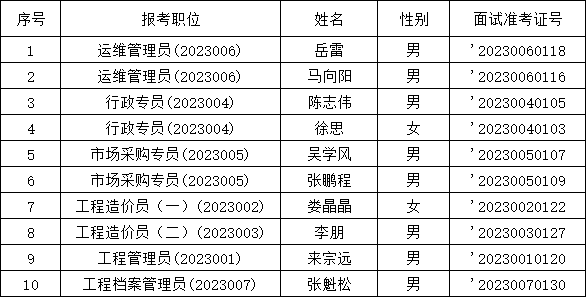 根據(jù)《亳州魏武國有資本投資控股集團有限公司2023年工作人員公開招聘》精神,經(jīng)筆試、面試、體檢、考察等環(huán)節(jié),確定岳雷等10名同志符合本次招聘條件,擬錄用為亳州魏武國有資本投資控股集團有限公司工作人員,現(xiàn)予公示。