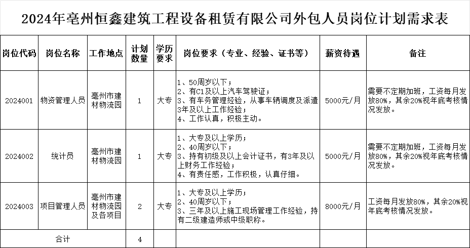 因工作需要,現委托亳州市譙騰人力資源管理有限公司面向社會招聘外包崗位人員4名;現將有關招聘事宜公告如下: