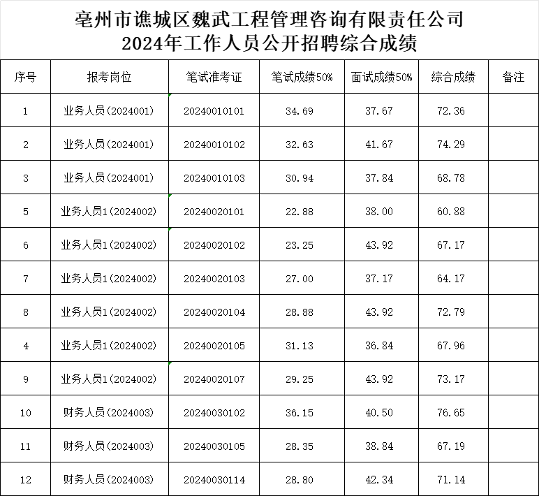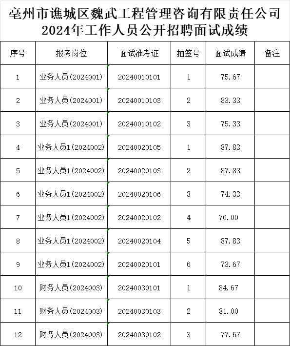 根據《亳州市譙城區魏武工程管理咨詢有限責任公司2024年工作人員公開招聘》有關規定,現將面試成績(見附件1)及綜合成績(見附件2)予以公示。
