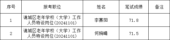 根據《2024年譙城區老年學校(大學)工作人員特設崗位公開招聘》精神,經面試、體檢、考察、選崗等環節,確定李賽陽、何婉晴2名同志符合本次招聘條件,擬錄用為2024年譙城區老年學校(大學)工作人員,現予公示。