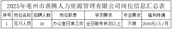 2025年亳州市譙騰人力資源管理有限公司公開(kāi)招聘有意愿的高校畢業(yè)生30名。